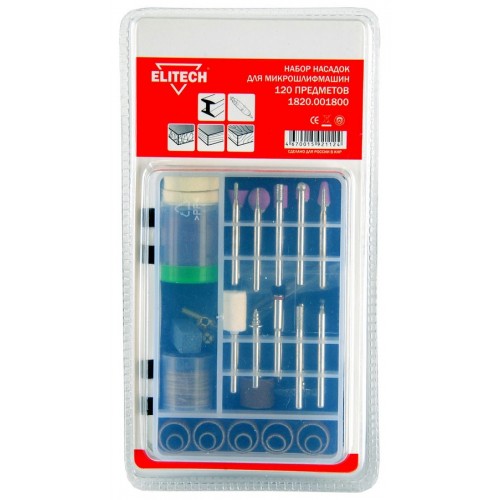 Набор ELITECH 1820.001800 расходных материалов для прямой микрошлифмашины. Набор 120 предметов : оправка для полировального круга, оправка для отрезного круга, оправка для шлифовальных колец 2 шт., шарошка шлифовальная (розовая) 5 шт., шарошка шлифовальная (белая), фигурная шарошка 7 шт., абразивное шлифовальное кольцо 12 шт., плоский полировальный круг 4 шт., нейлоновая кардщетка, латунная кардщетка, фрезерное сверло, цанга 3 шт., HSS сверло 3 шт., фигурная шарошка (белая), шлифовальный лист 40 шт., отрезной абразивный круг 36 шт., правильный камень, ключ.