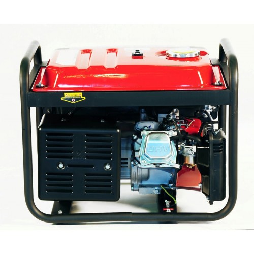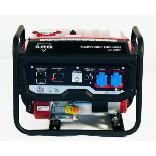 Электростанция СГБ 2500 Р с четырехтактным бензиновым двигателем. Однофазная. Номинальная мощность 2 кВт. Две розетки 220В/16А. Ручной стартер. Автоматическое отключение при низком уровне масла в картере