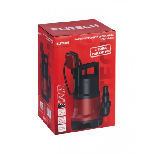 Погружной дренажный насос «ELITECH» мощностью 400 Вт и производительностью 8000 л/час предназначен для перекачивания загрязненной воды с диаметром твердых частиц не более 35 мм из колодцев, открытых водоемов, затапливаемых подвалов и других источников.