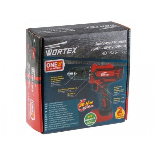 Аккум. дрель-шуруповерт WORTEX BD 1825-1 DLi в кор. ALL1 (18.0 В, БЕЗ АККУМУЛЯТОРА И ЗУ, 2 скор., 30 Нм, шурупы до 8 мм)