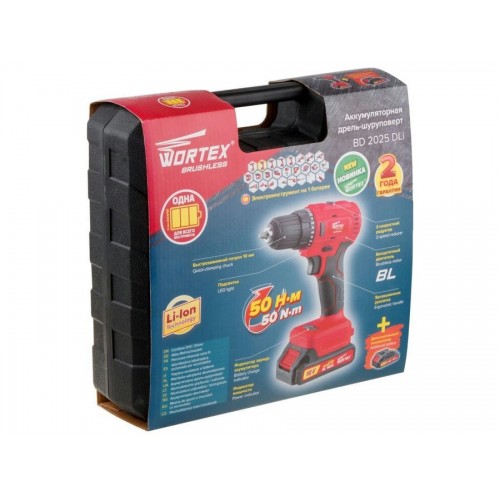 Аккум. дрель-шуруповерт WORTEX BD 2025 DLi в чем. ALL1 БЕСЩЕТ, 18 В, 50 Н*м, 2х2 А*ч, БЗП 10 мм (шурупы до 9 мм)