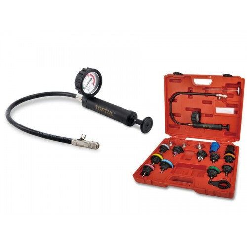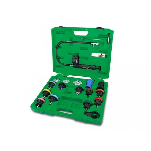 Набор TOPTUL JGAI1802: для проверки утечки радиатора и системы охлаждения стороны насоса и тестирования адаптеры сделаны из твердого и прочного материала Нейлона 66 давление в диапазоне: 0-35 psi, 0-2,5 бар с клапаном выпуска и быстросменным адаптером. Комплект включает в себя: тестирование давление насоса, манометр, термометр, иглы, 13 радиатора комплектов, 2 разъема, переходники ручные.