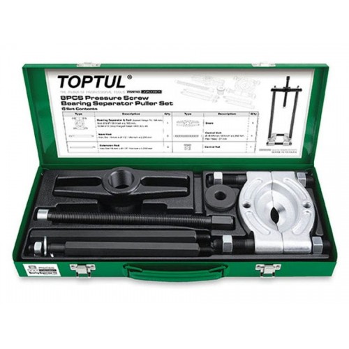 Набор съемников спараторного типа Toptul JGAD0801 состоит из 8 предметов (75-105 мм) и предназначен для съема шариковых и роликовых подшипников, а также внутренних колец. Сепаратор сжимается благодаря равномерному затягиванию гаек на распорных болтах.