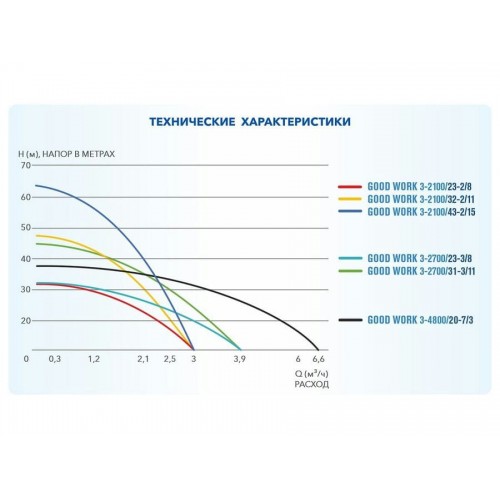 Расшифровка модели насоса на примере: AGELESS-3-210023-28 - Сначала идет серия: AGELESS - серия насосов с 2м кабелем требующим удлинения (вилки нет) GOOD WORK - серия насосов с длинным кабелем вилка - Затем диаметр насоса: 2,5 - диаметр 2,5 дюйма 3 - диаметр 3 дюйма - Далее следует производительность: 210023 - значит, что насос качает 2,1 м3 в час при напоре 23 м - Затем идет обозначение максимальной производительности: 2 - до 3 м3 в час. 3 - до 4 м3 в час - Количество рабочих колёс обозначается последней цифрой: - Обозначение наличия пусковой коробки: А (буква А есть) - пусковой коробки нет (значит конденсатор внутри корпуса насоса кабель трехжильный) (буквы А нет) - пусковая коробка есть (значит конденсатор внутри коробки кабель четырехжильный)