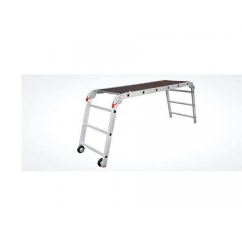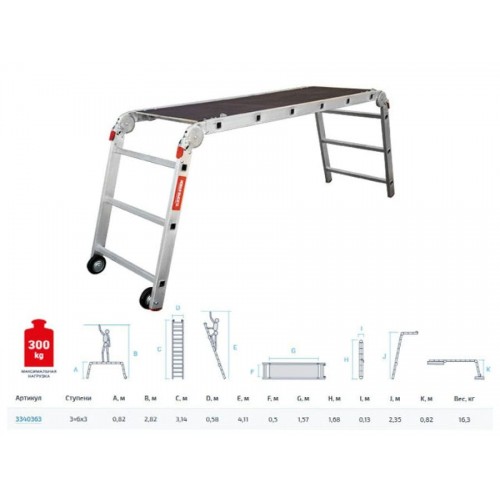 СТУПЕНИ: 3x6x3 РАБОЧАЯ ВЫСОТА: 282411 см ГАРАНТИЯ: 3 года Варианты использования: помост, приставная лестница, приставная согнутая лестница Складные рабочие подмости из алюминиевого профиля Идеально подходят для всех видов работ, требующих большой площадки Нескользящий настил из водостойкой ламинированной фанеры Настил легко снимается для использования изделия в качестве приставной лестницы Легко устанавливаются и складываются в компактное положение для хранения и транспортировки Шарнирные замки регулируются одной рукой Надёжная автоматическая фиксация Оборудованы съёмными колёсами для большей мобильности Рабочая нагрузка и оптимальный размер площадки позволяет вести работу одновременно двум рабочим Стойки и ступени из экструдированных алюминиевых профилей Стойки с дополнительным усилием в наиболее нагруженных местах для повышения прочности Рифлёная поверхность ступеней для безопасного подъёма и спуска Многократная развальцовка в соединении ступеней со стойками обеспечивает высокую прочность и долговечность Опорные наконечники из прочного пластика для устойчивого положения Компактность при хранении и транспортировке Практичность и внимание к каждой детали гарантируют безопасность работы на любой высоте