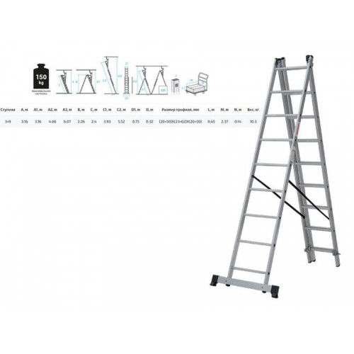 Лёгкая и прочная лестница 5 в 1 для бытового использования: приставная, раздвижная, двухсторонняя стремянка, стремянка с выдвижной секцией, лестничный марш. Функция Лестничный марш (установка на разноуровневой поверхности). Верхняя секция легко снимается для использования в качестве отдельной приставной лестницы. Стойки и перекладины из экструдированного алюминиевого профиля. Рифлёные перекладины 23?23 мм для надёжного сцепления. Вальцовочное крепление перекладин. По прочности не уступает сварке. 2 зацепа и автоматический фиксатор секции на нужном шаге. Кронштейны соединяют и направляют секции. Пластиковые вставки обеспечивают плотное соединение и улучшают скольжение. Страховочные погодоустойчивые ремни на заклёпках с увеличенной шляпкой. Создают жёсткую конструкцию. Не гниют и не выгорают. Широкая съёмная опорная траверса стабилизирует конструкцию. Алюминиевая стяжка создаёт жёсткий треугольник и фиксирует рабочее положение (для лестниц 3?15-3?17). Усиленная траверса с нескользящими башмаками из 2х-компонентного пластика с прорезиненной опорой (для лестниц 3?15-3?17).
