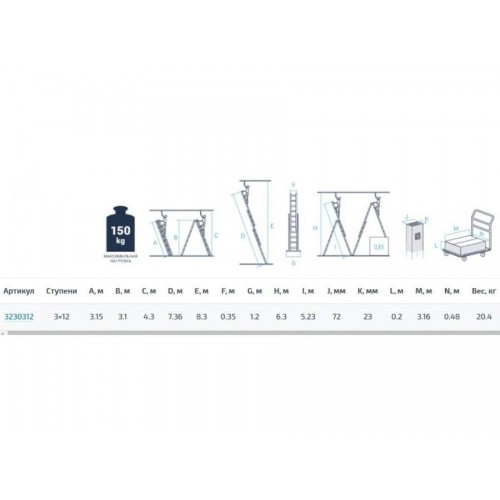Лестница алюм. 3-х секц. 310/736/315 см 3х12 ступ. 20,4кг NV3230 Новая Высота (макс. нагрузка 150кг)