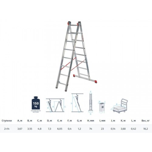 Технические преимущества: Направляющие кронштейны из прессованного алюминиевого сплава для надежного удержания выдвижной секции во всех рабочих положениях. Рифлёные ступени с шагом 260 мм для безопасного подъёма и спуска. Надёжно закреплённые на стойках и траверсе опорные наконечники из двухкомпонентного пластика: жесткий компонент отвечает за надежность крепления, мягкий препятствует скольжению лестницы. Широкая поперечная траверса для повышения устойчивости. Многократная развальцовка в соединении ступеней со стойками для высокой прочности и долговечности. Стойки и ступени изготовлены из прессованного алюминиевого профиля. Алюминиевые зацепы с автоматическим фиксатором. Варианты использования: приставная лестница приставная выдвижная двухсекционная лестница приставная выдвижная лестница двухсторонняя стремянка Максимальная нагрузка - 150 кг Рабочая высота - 480-730 см